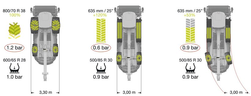• Weniger Fahrwiderstand, weniger Schlupf, weniger Kraftstoffverbrauch und größere Hangstabilität durch optimierte Traktion